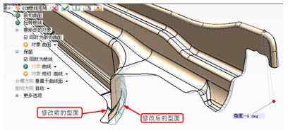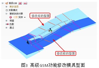 快速的绘制出需要的截面线,然后使用图1中的高级GSM功能就可以轻松完成模具型面的修改。其结果见图3所示,修改后的曲面保持原有曲面的质量、数量和曲面拓补关系。