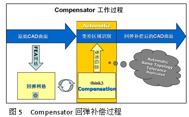 将Compensator技术和FEA数据配合使用能够提高模具设计效率,设计师再也不必花费大量时间来重建回弹补偿的曲面 ,其工作过程为图5所示的3个步骤: