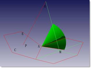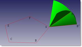 找出六边形另外一条边的位置。线段AB’绕着AB旋转,生成曲面一;线段AE’绕着AE旋转生成曲面二,取曲面一和曲面二的一条交线则为六边形的另外一条边界。这里不妨取AH。