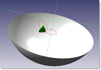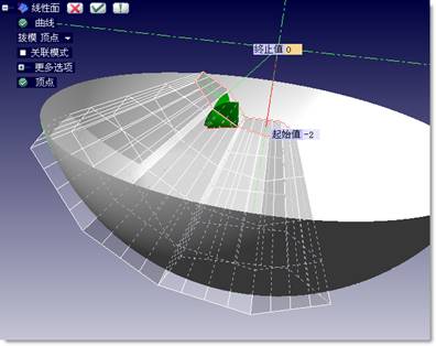 然后,用五边形和六边形的边做线性面,选择模式为顶点,其中顶点为球心O。由于五边形和六边形在半径为150mm的球体内,因此延伸参数中起始值设置为-2(直到线性面和球底端完全相交)。