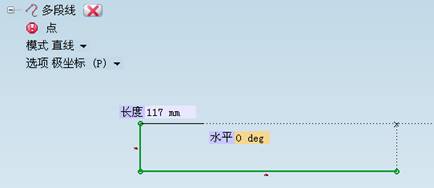 2)利用“多段线”命令绘制草图。绘制过程中可以定量输入线段的长度与角度。也可不顾及具体尺寸而先大致绘制草图形状,然后标注尺寸,精确调整草图。