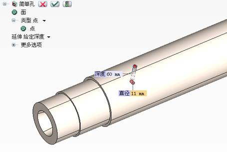 单击“简单孔”命令,在主轴表面选择一个期望的点,在主轴壁上添加一个孔特征。如图9所示。