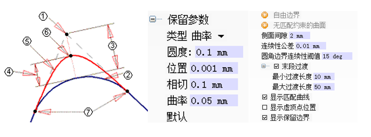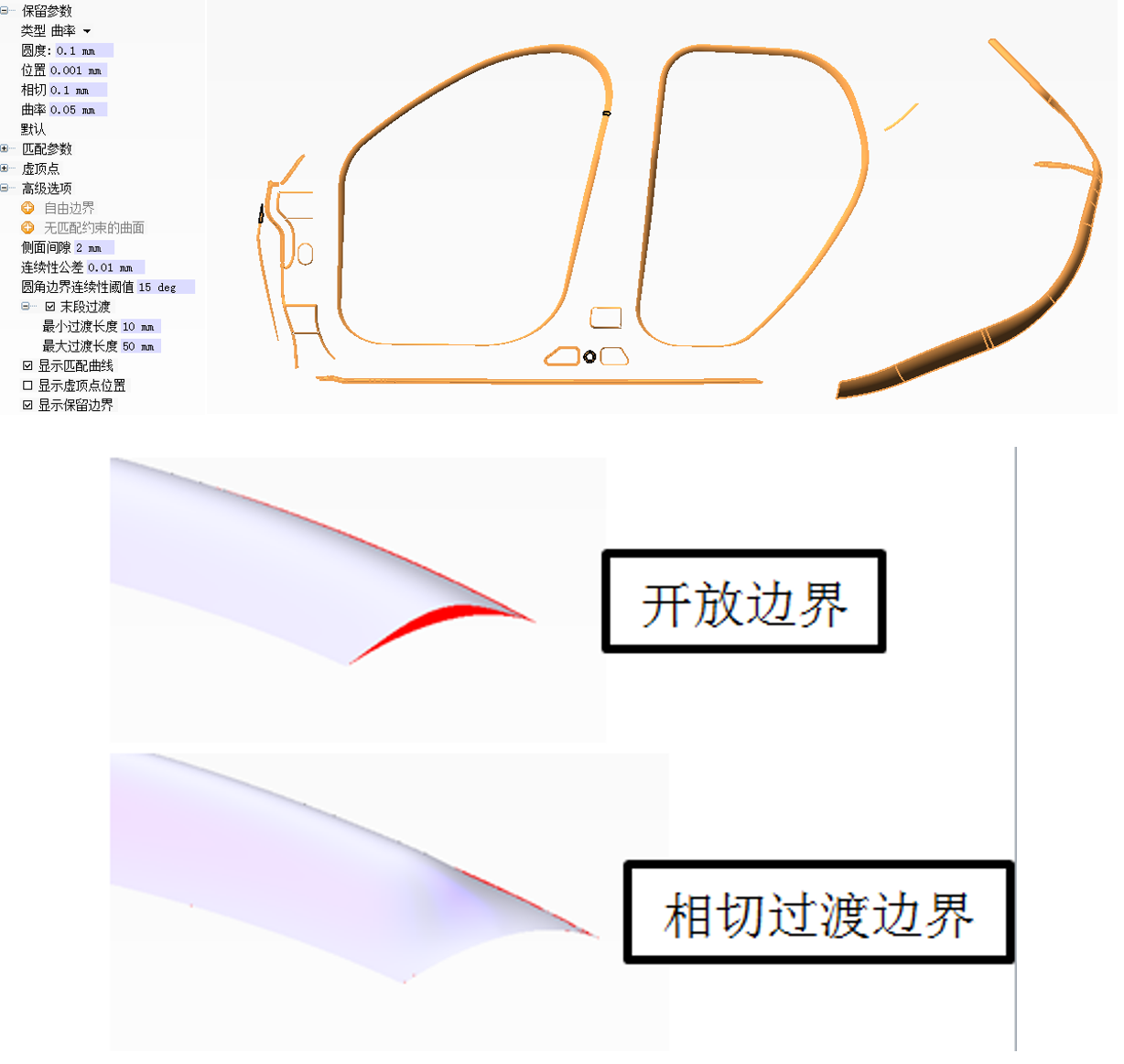可选择圆角保留的连续性(自由/位置/相切/曲率),对不保留位置可设置为自由边界或无匹配约束的曲面;
