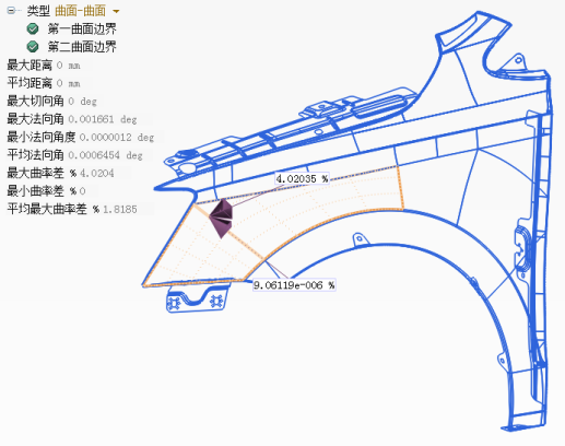 必须满足相邻曲面间之间隙在 0.003mm 以下(有些汽车厂甚至要求到 0.001mm),切率改变 ( tangency Change ) 在0.1度以下,曲率改变 (curvature change) 在0.05以下,符合这样的标准才能确保钣件的环境反射不会有问题。