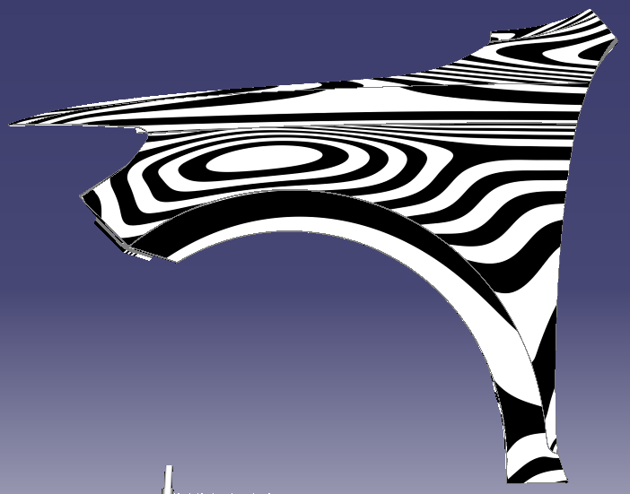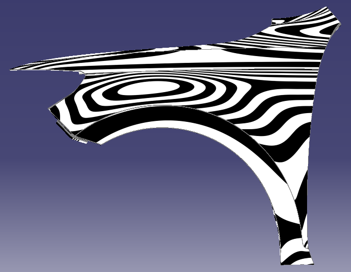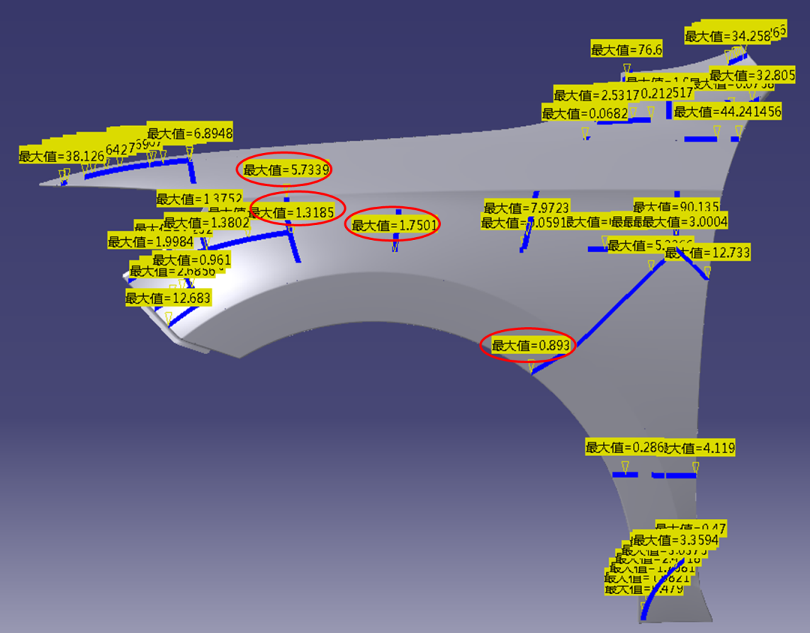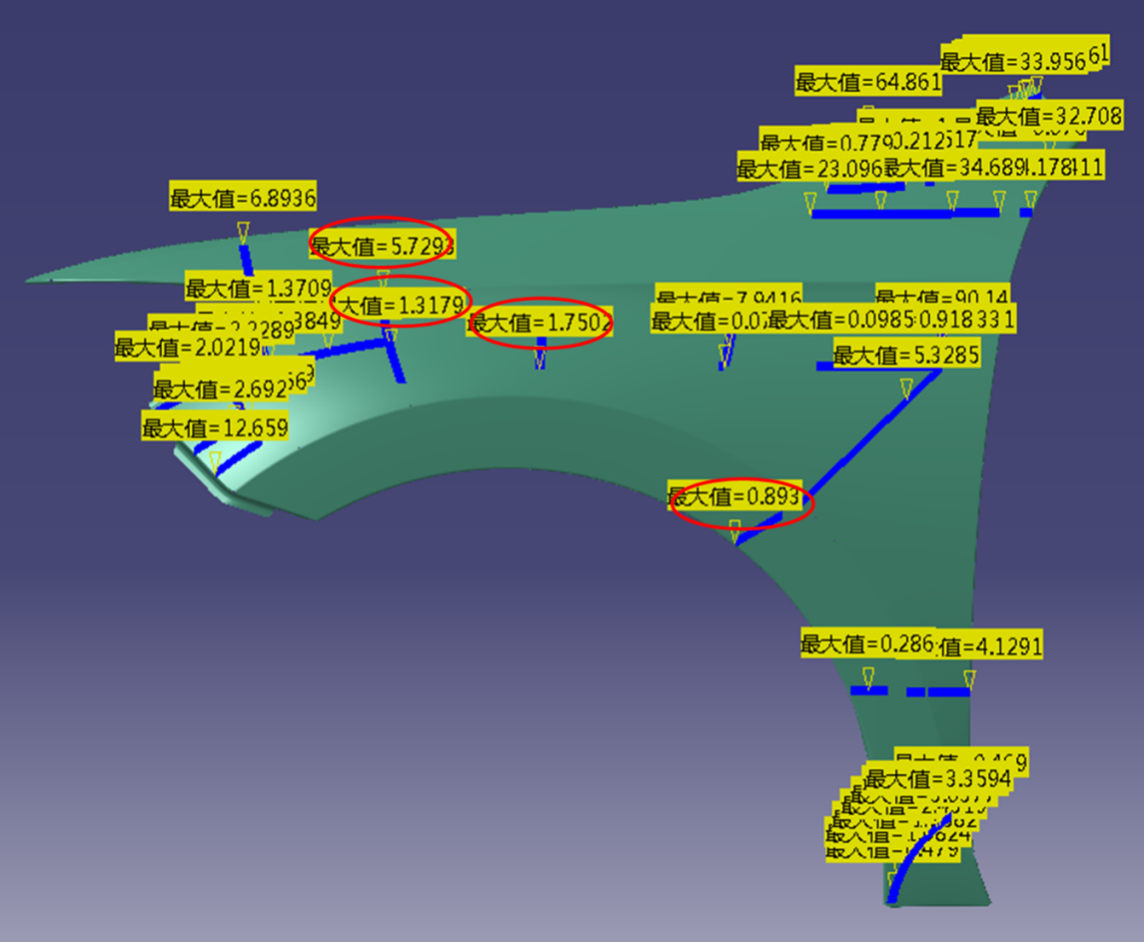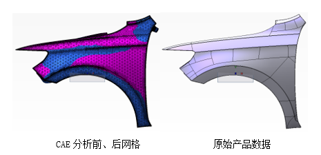 在CAE软件中,可以把分析前、后数据以网格格式导出(afnasstl),把原始产品数据与CAE分析前、后网格输入TD,即可自动完成补偿。整个过程完全自动,补偿后数据可以保持原有A面质量。例如以下的翼子板案例: