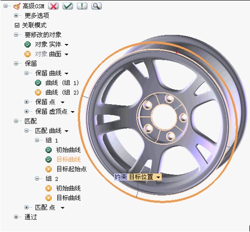 选择轮毂实体作为要修改的对象,使用套索选择工具,选择与轮轴配合的部分作为保留的曲线,在匹配选项中,选择原轮毂外圆作为初始曲线,偏移后的曲线为目标曲线,如下图: