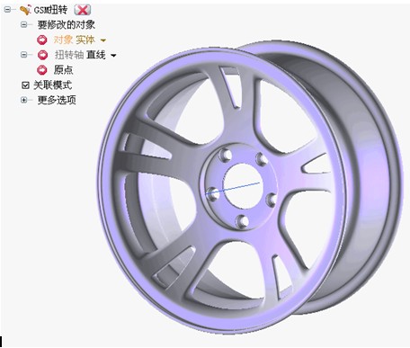 设定整个轮毂为要修改的对象实体,步骤1中所做的直线为扭转轴。如下图: