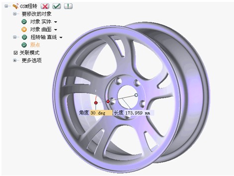修改角度参数框,或者拖动角度控标,控制轮辐的扭转角度。