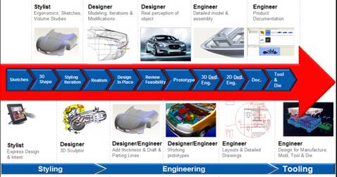 ThinkDesign是一款覆盖工业设计、工程设计、工模具设计三个阶段的3D CAD软件,支持从一张草图开始的到加工产品所需的模具设计的整个设计流程(如图1所示),不同部门之间的数据传递均可在同一CAD平台上进行。概念设计师完成的3D模型可以直接传递给工程设计师、工程设计完成后的模型可以直接传递给工艺设计师。以前需要多个CAD系统完成的流程现在在一个CAD系统中便可完成。整个过程数据的传进流畅而安全,不必再担心模型在不同CAD系统之间转换发生的数据丢失,也不必再需要重新构建模型。