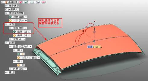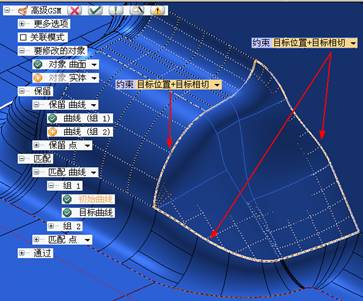 2)  选取需要保留的边界,定义其与相邻曲面的连接关系(G0、G1、G2)。