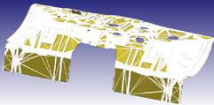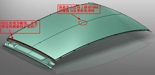 图3-3是某车型的顶盖,顶部大面为A面,材料为ST14,料厚0.7mm。在试模过程中发现存在回弹,需要对产品模型做图3-3所示的修改,采用其他软件需要删除曲面后重新构建,其过程费时费力,下面采用ThinkDesign来完成需要修改的两个任务。