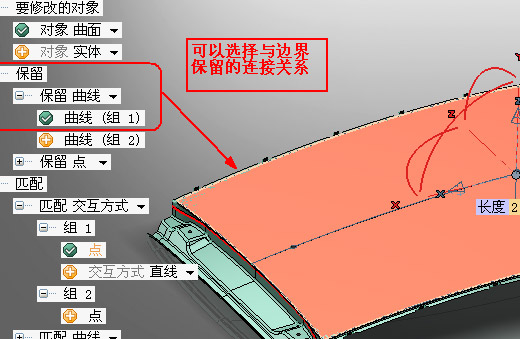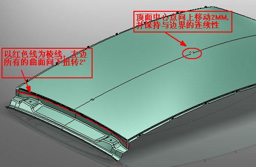 举一个车型顶盖修改的例子,如图一,该设计任务需要将顶面中心点向上移动2mm,并保持与边界的连续性,同时,以红色线为棱线,左边所有的曲面向下扭转2°。如果采用其他设计软件则需要删除曲面后重新构建,过程费时费力,而用ThinkDesign的GSM功能不到半个小时就完成了修改设计任务。