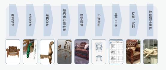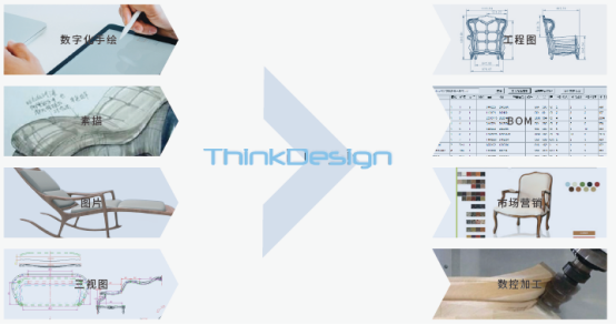 ThinkDesign中,家具产品设计可以从草绘、素描、三视图、图片开始,通过3D设计,可以得到精确的3D数模、工程图、BOM。产品研发、制造流程以3D设计为中心,从而实现高效的研发管理与加工制造。